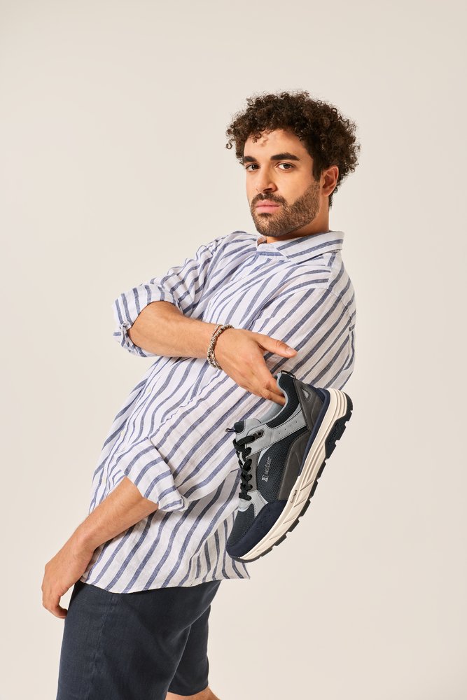 Der neue Sneaker 09100-14 von Rieker präsentiert sich in einem dunklen Blauton und punktet mit angenehmer Leichtigkeit. Das Obermaterial aus textilem Gewebe und Lederimitat passt sich dem Fuß gut an, während der weiche Schaftrand und der praktische Gummizug das An- und Ausziehen erleichtern. Bei Bedarf kannst Du den Sneaker mit den beiliegenden Senkeln zum vollwertigen Schnürschuh machen. Die flexible EVA/Gummi-Sohle macht den Schuh besonders leicht und sorgt für ein gedämpftes Laufgefühl. Innen bietet die herausnehmbare Memosoft-Einlegesohle mit weicher Polsterung spürbaren Komfort bei jedem Schritt. Durch die extraweite Passform H eignet sich der Sneaker auch für etwas breitere Füße.Ob für entspannte Wege, kurze sportliche Einheiten oder einfach als bequemer Begleiter im Alltag – dieser Sneaker macht Deinen bewegten Alltag mühelos mit!
