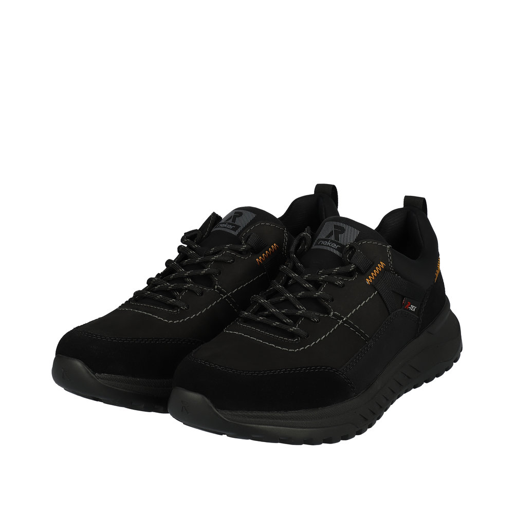Mit diesem schwarzen Sneaker U0100-00 von Rieker bist du im Alltag gut unterwegs. Das Obermaterial aus Rauleder verleiht dem Schuh eine sportlich-edle Optik, während die flexible und ultraleichte Sohle aus EVA und Gummi für spürbar hohen Laufkomfort sorgt – auch an langen Tagen. Dank Schnürung sitzt der Schuh sicher am Fuß und lässt sich individuell anpassen. Die gepolsterte, herausnehmbare Einlegesohle sorgt gemeinsam mit der komfortablen Weite im Vorfußbereich für ein angenehmes Tragegefühl – mehr Platz, weniger Druck. Für zuverlässigen Wetterschutz ist der Sneaker mit der wasserabweisenden RiekerTEX-Membran und einem atmungsaktiven Textilfutter mit Drysport-Technologie ausgestattet. So bleiben deine Füße auch bei feuchtem Wetter trocken und warm. Ein vielseitiger Freizeitschuh, der Komfort, Funktion und sportliches Design ideal verbindet und auch für Touren abseits der Wege geeignet ist.